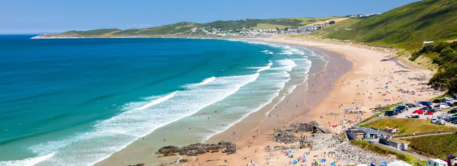 Putsborough Beach (Putsborough Sands) is a beautiful, golden, sandy beach in North Devon, forming the southern end of Woolacombe Sands, known for its clean water, good surf, and quieter atmosphere, offering facilities like parking, a surf shop, café, and rock pools, making it great for families and surfers.