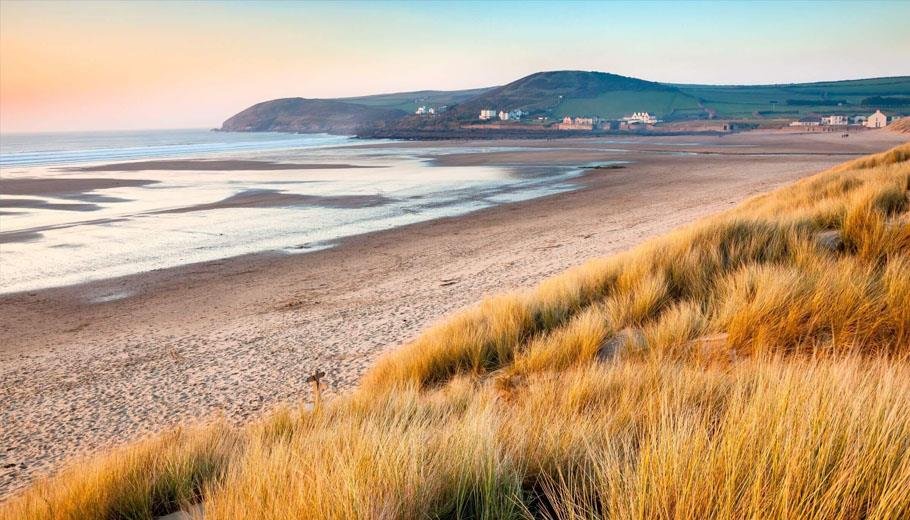 Saunton Sands is a stunning 3-mile golden sand beach in North Devon, famed for its long, gentle waves ideal for beginner surfers, backed by the UNESCO Braunton Burrows dunes, and is dog-friendly year-round, offering facilities like cafes and shops, though it lacks lifeguards, making it great for families, walkers, and watersports enthusiasts