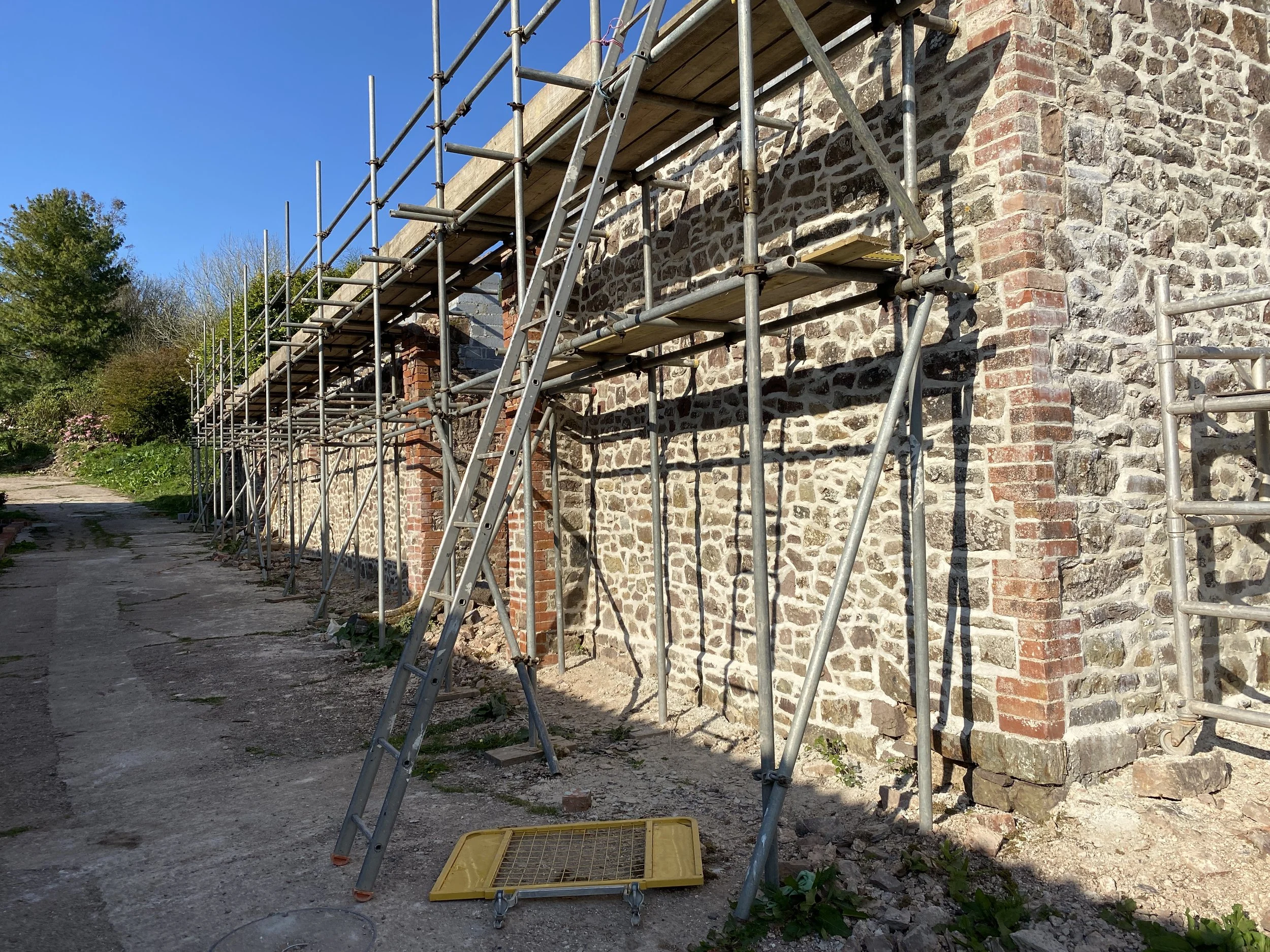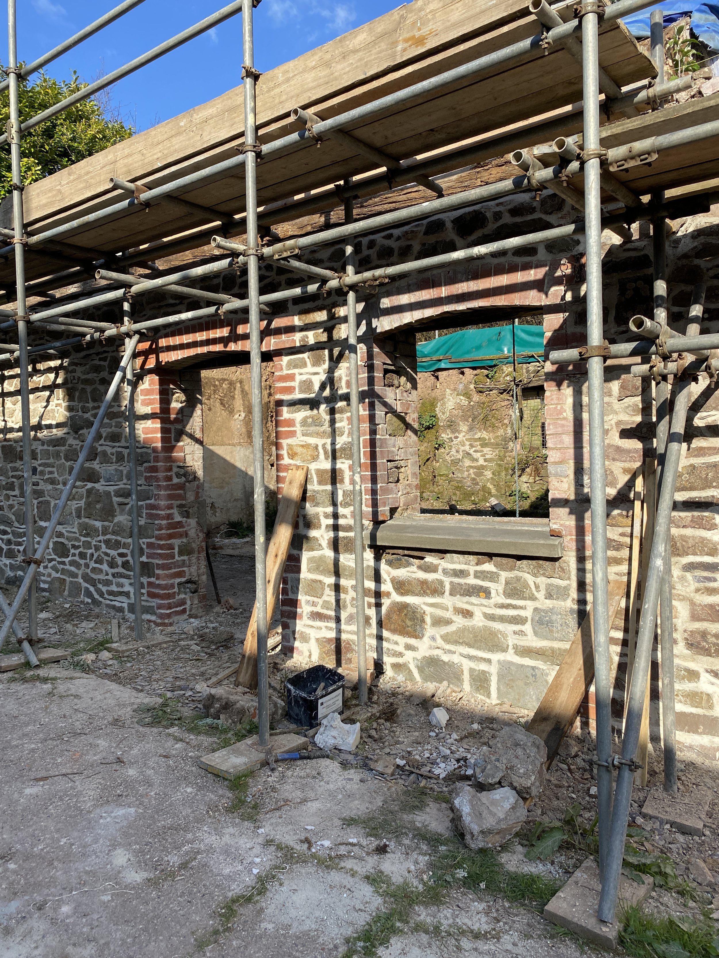 In February and March 2022 the scaffolding went up and our wonderful building team of Rob and Russ started securing the walls. We also managed to finally secure the funding for the barn conversion, which was a huge relief as work had already begun. Progress was quick for the first three to four months: the outer stone walls were capped, inner walls were built, windows received new lintels and preparations for the roof timbers were underway.